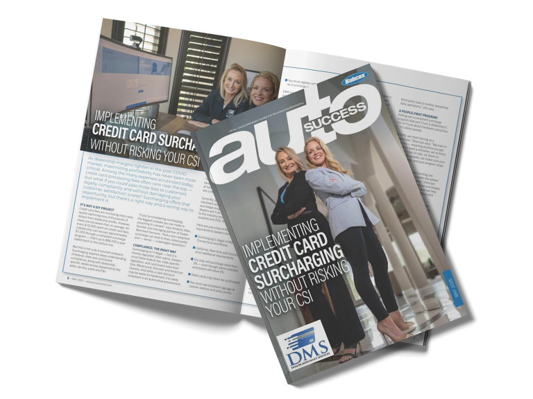 Dealer Merchant Services helps dealers recoup one of their largest expenses, credit card processing fees, by helping them pass along those fees to their customers. Our patented technology keeps dealers in compliance, and our proprietary training focuses on the best customer experience to maintain great CSI.
